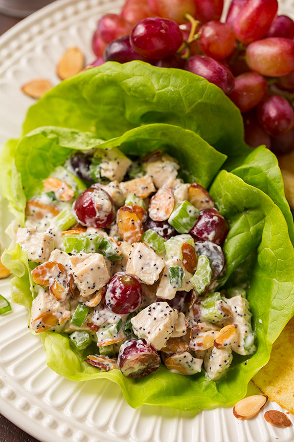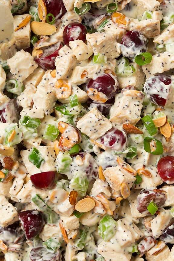 - Add all chicken salad ingredients to a large mixing bowl or a salad bowl. Add dressing and toss to evenly coat. Store in refrigerator. Serve within 1 - 2 hours for best results (it's still good for another day but the almonds soften a little and the grapes juices run into the dressing).
