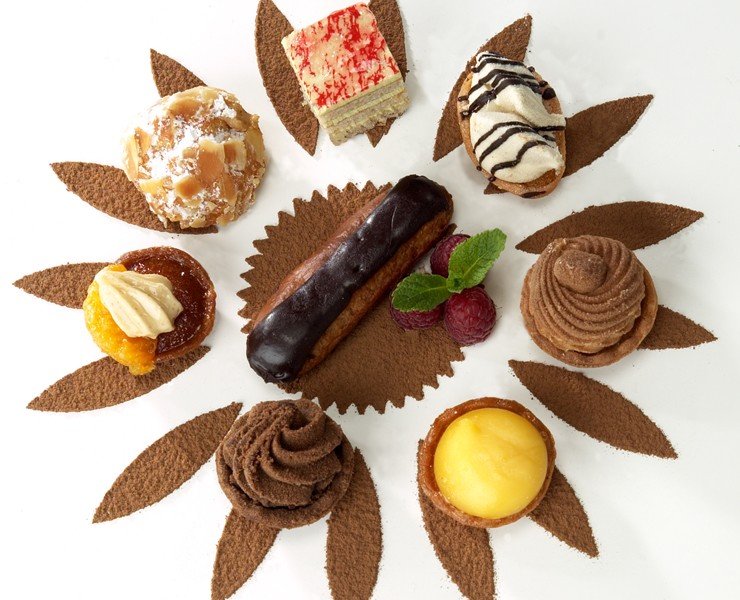 Chocolate Tartlets, Choux Praline, Pistachio Squares, Tangerine Tartlets, Chocolate Eclairs, Coffee Eclairs, Raspberry Tartlets, Opera Squares, Lemon Tartlets. (Approximately .58 oz each)