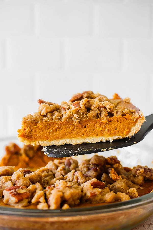This crowd favorite bourbon pumpkin pie has a salted brown butter pecan streusel. A creative and delicious way to level up your pumpkin pie game this Thanksgiving!