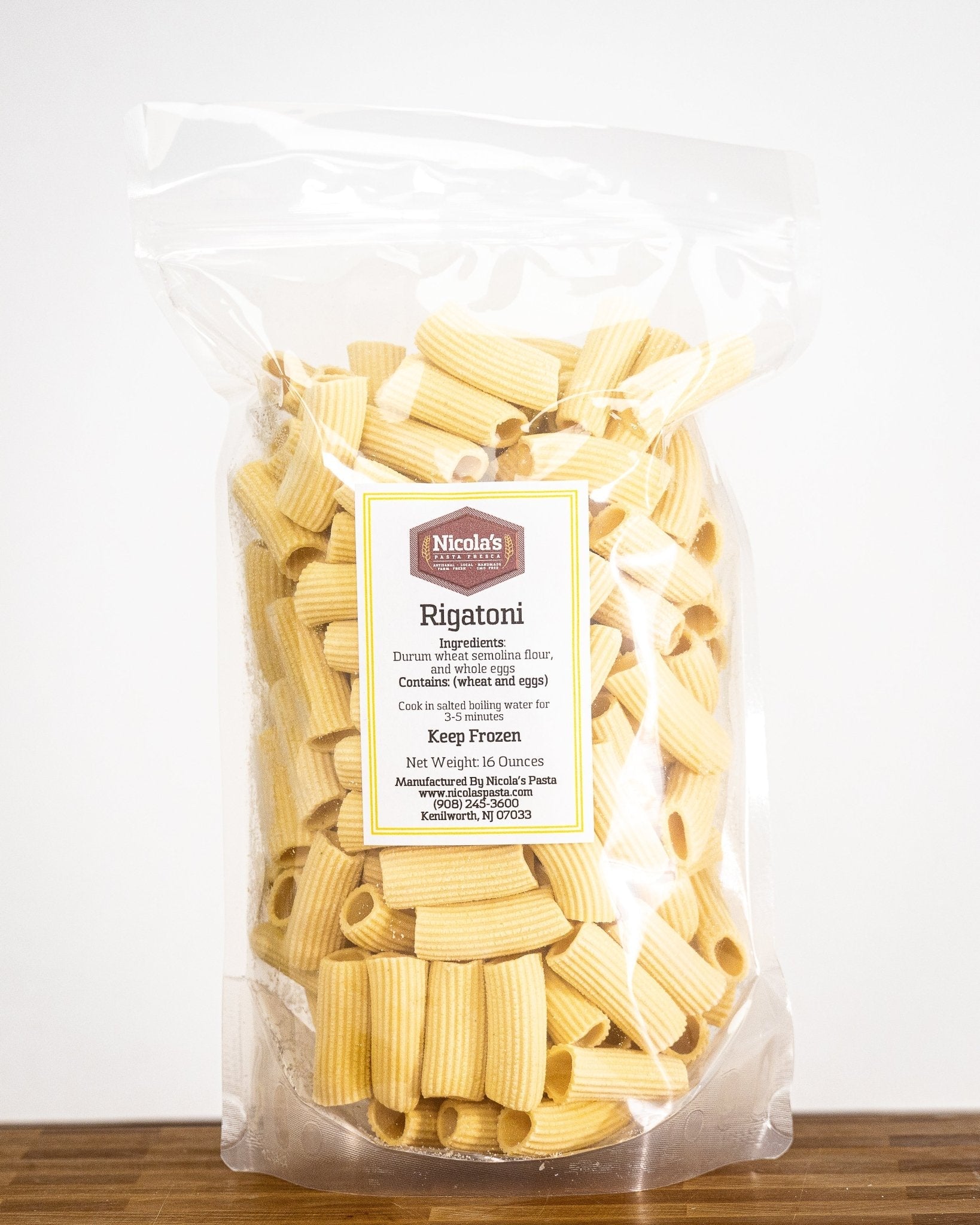 ##0##Enjoy the boldest flavor from our pasta menu with our dairy-free Rigatoni Pasta. Made in traditional Italian style with freshly sourced organic eggs and semolina flour sourced directly from Italy. It’s perfect for dinner or to gift someone and great for anyone who is lactose-intolerant. The ridges and holes in rigatoni make it great for pairing with any sauce, from creamy or cheesy to chunky meat sauces. It’s made fresh to order and flash frozen to retain freshness, hence it contains no preservatives.
