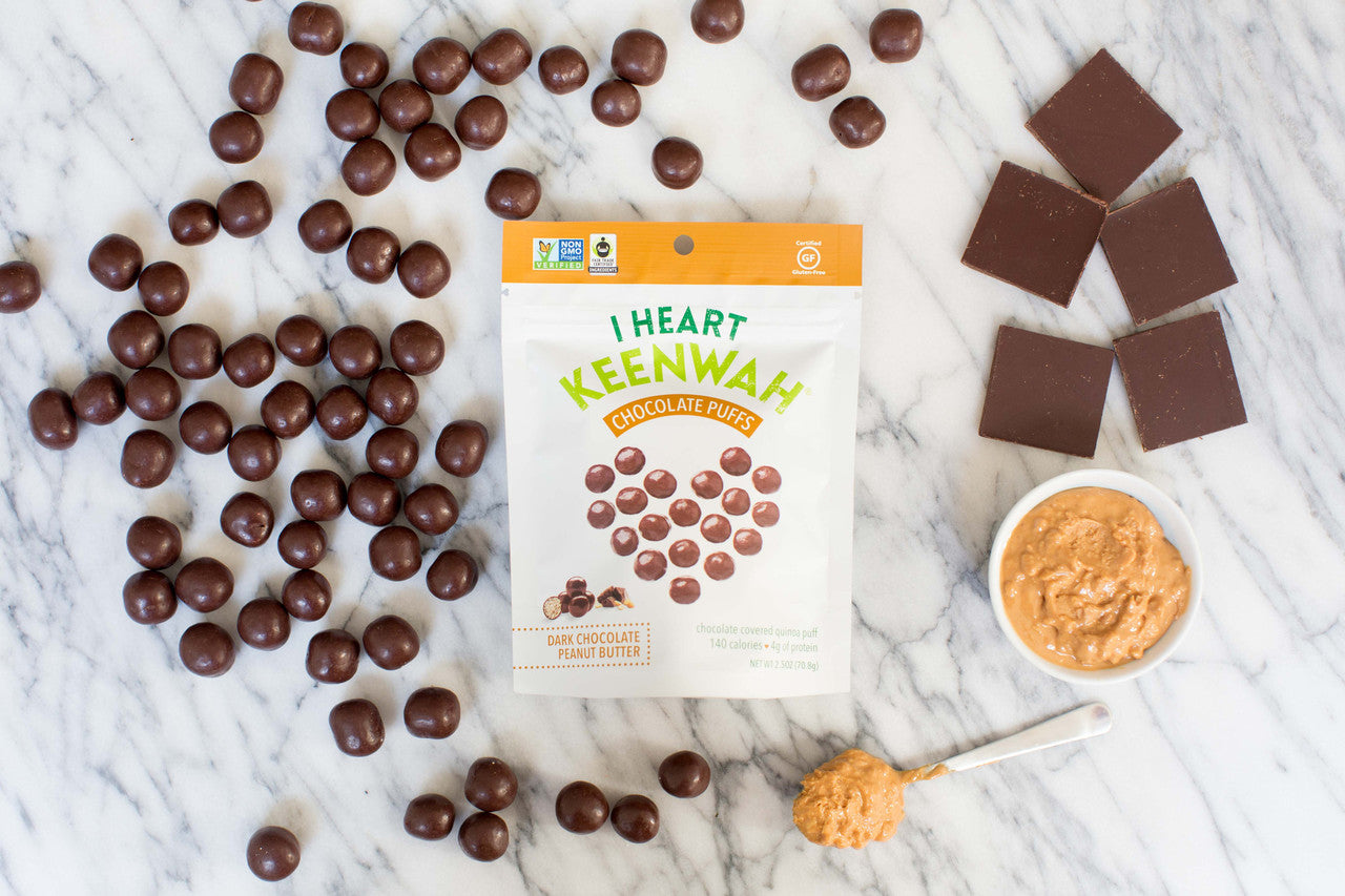 Our new product! Our chocolate peanut butter quinoa puffs are a new spin on chocolate-covered snacks. Each puff is enrobed in indulgent dark chocolate and creamy peanut butter for a perfectly balanced bite. Heart yourself with a handful.