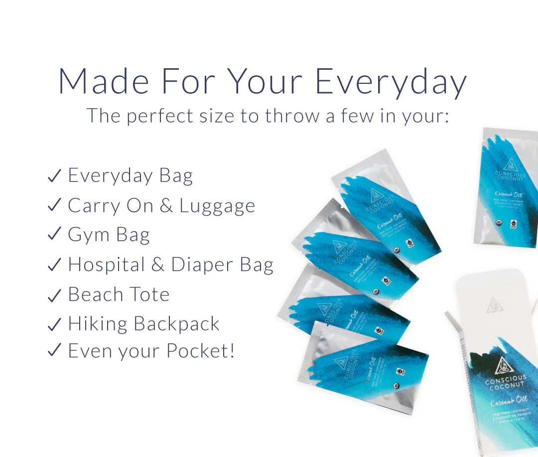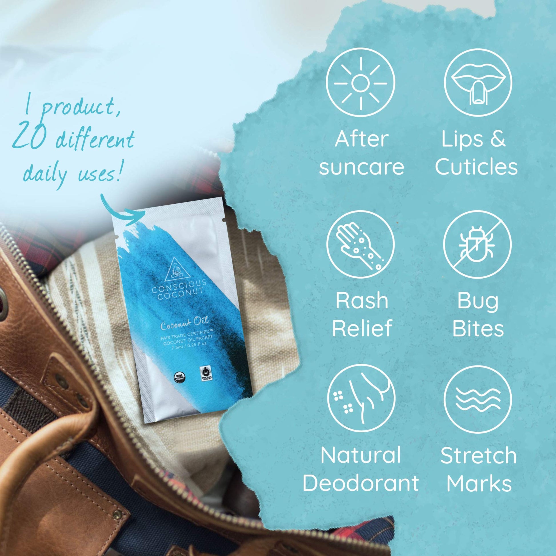 - CERTIFIED ORGANIC COCONUT OIL - Conscious Coconut is available in packs of 5, 10, and 25 one-time use packets. Each coconut oil travel size packet is specially designed for use at home or on-the-go.- This multipurpose cooking oil, face oil and hair oil is safe for the entire family. It is made from naturally grown and sourced coconuts. We do not expose our raw coconut oil to any harmful chemicals.