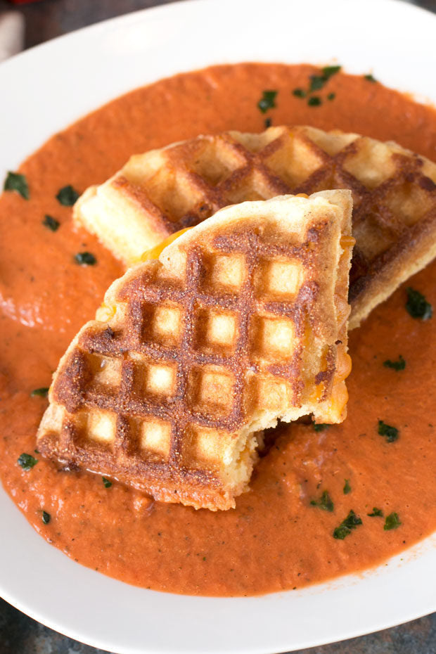 Cornbread Waffle Grilled Cheese Sandwich with Tomato Basil Soup