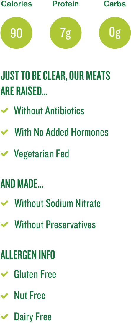 Just a bit of peppery kick. Crafted with lean, humanely-raised beef and pork, cracked pepper and a classic mix of spices for nourishing real meat protein.