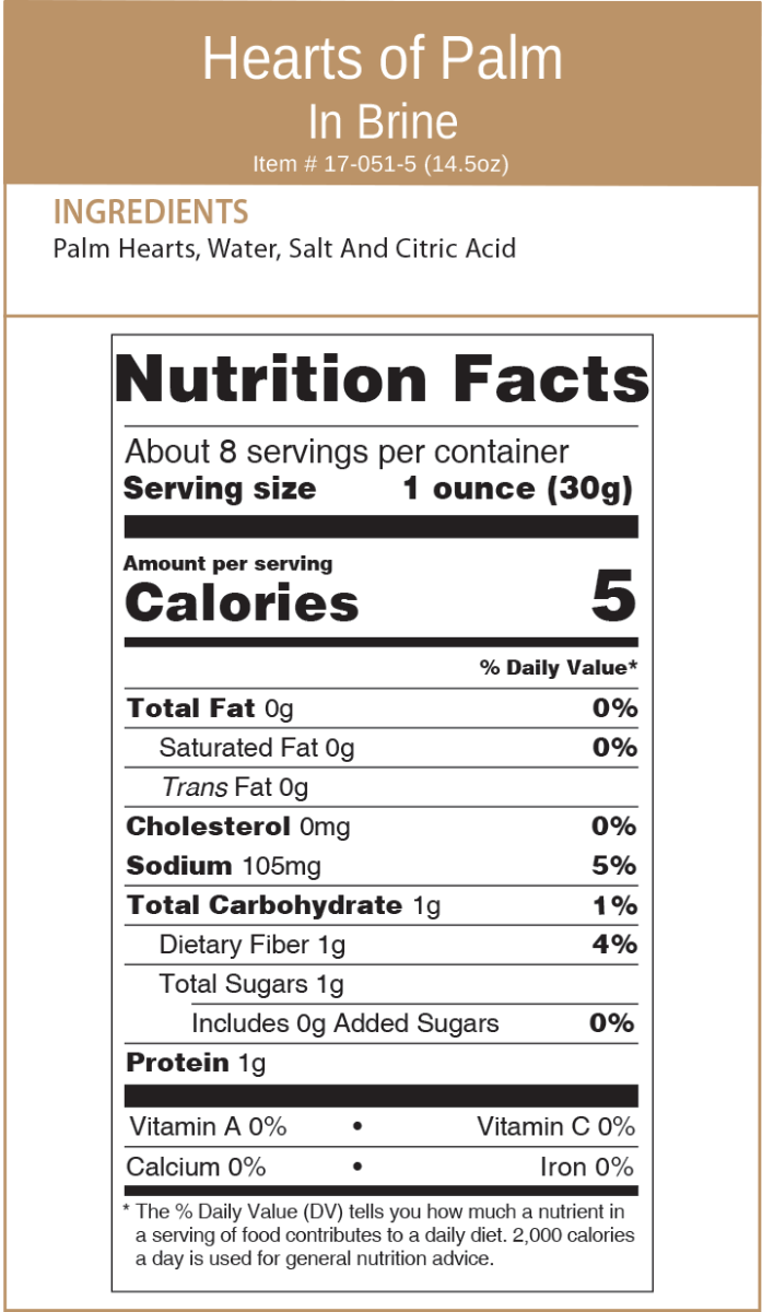 INGREDIENTS: Palm Hearts, Water, Salt, And Acidifying Agent: Citric Vegan