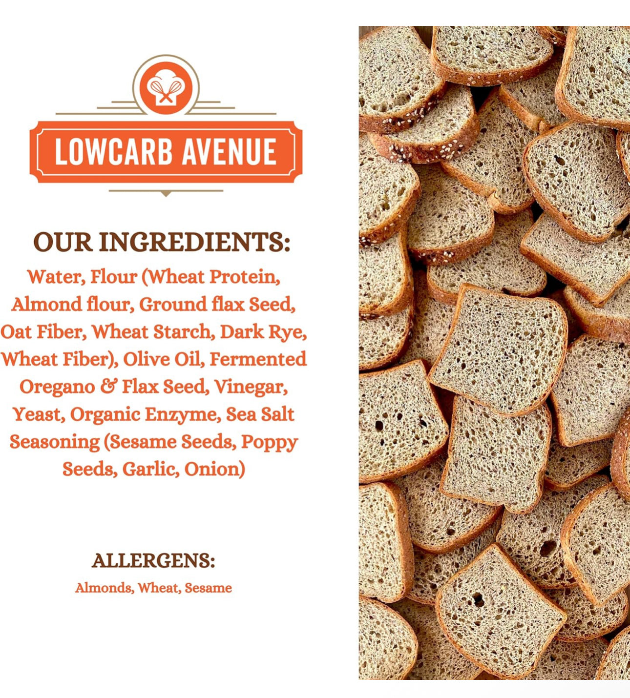 Water, Flour (Wheat Protein, Almond flour, Ground flax Seed, Oat Fiber, Wheat Starch, Dark Rye, Wheat Fiber), Olive Oil, Fermented Oregano & Flax Seed, Vinegar, Yeast, Organic Enzyme, Sea Salt Seasoning (Sesame Seeds, Poppy Seeds, Garlic, Onion)