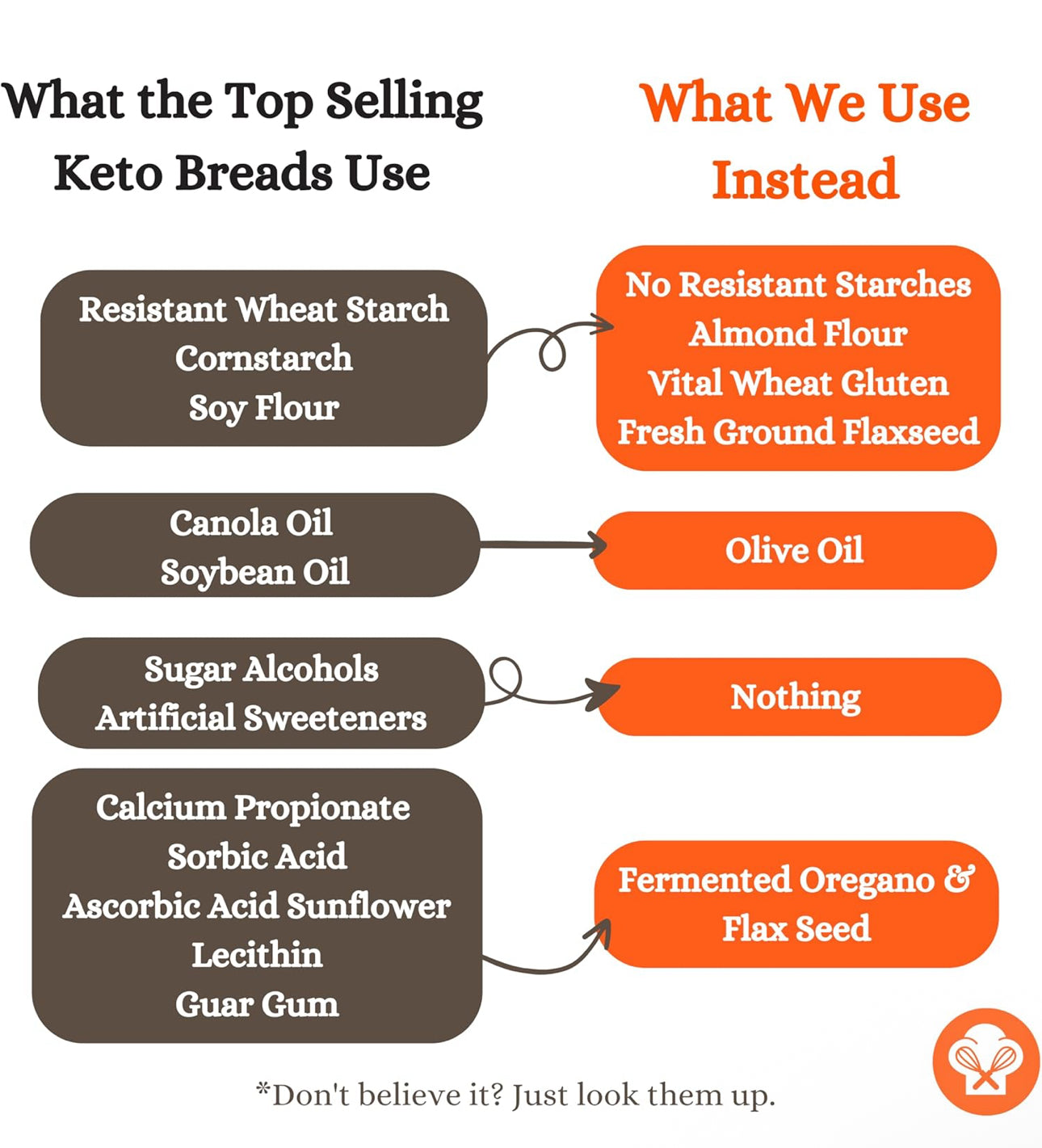 - GUILT FREE AND VERSATILE - You can eat me guilt free! With zero sugar, no cholesterol, no trans fat, nearly zero carbs, and the most nutritious ingredients, what’s there not to like? Our bread can be called many things: wheat bread, white bread, sandwich bread, brioche bread, rye bread, oat bread, and best of all keto bread zero carb!