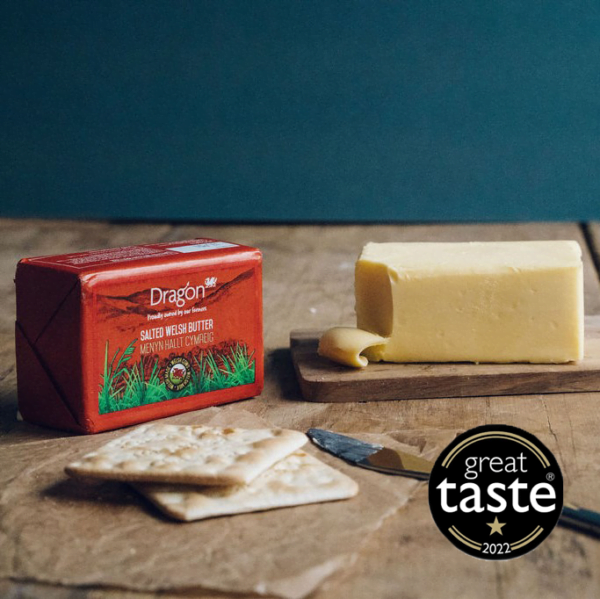 Award winning Welsh churned butter made to an original recipe with distinctive salty flavor. Made from milk from Welsh cows grazed on the open pastures of North and West Wales is the only milk used in Dragon's award-winning cheese and butter.