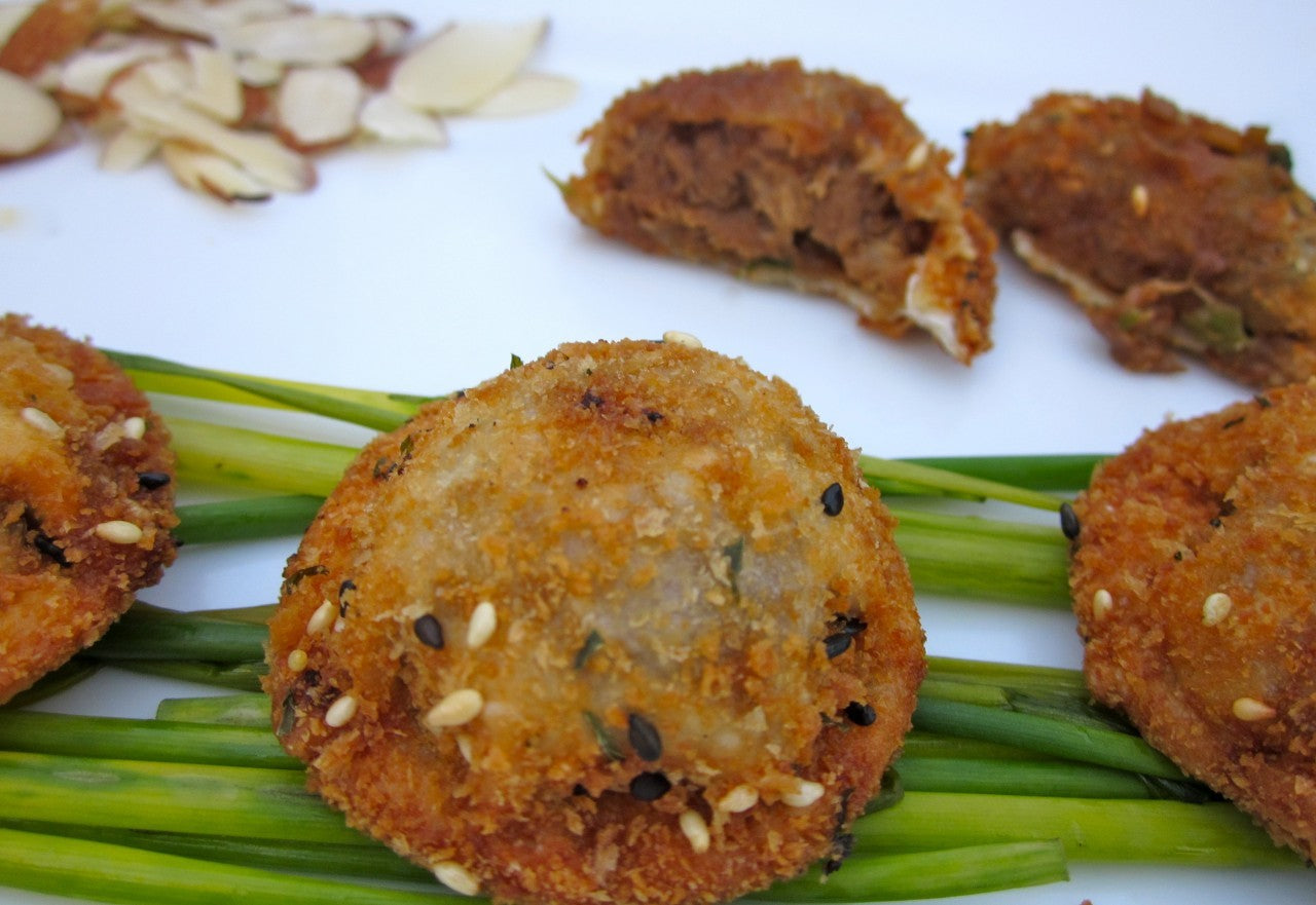Peking style duck filled ravioli, lightly dusted with panko breadcrumbs and black and white sesame seeds.