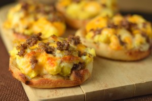 - Add sawmill gravy to the open faced toasted English Muffin then top with scrambled eggs, slice of cheese and sausage.