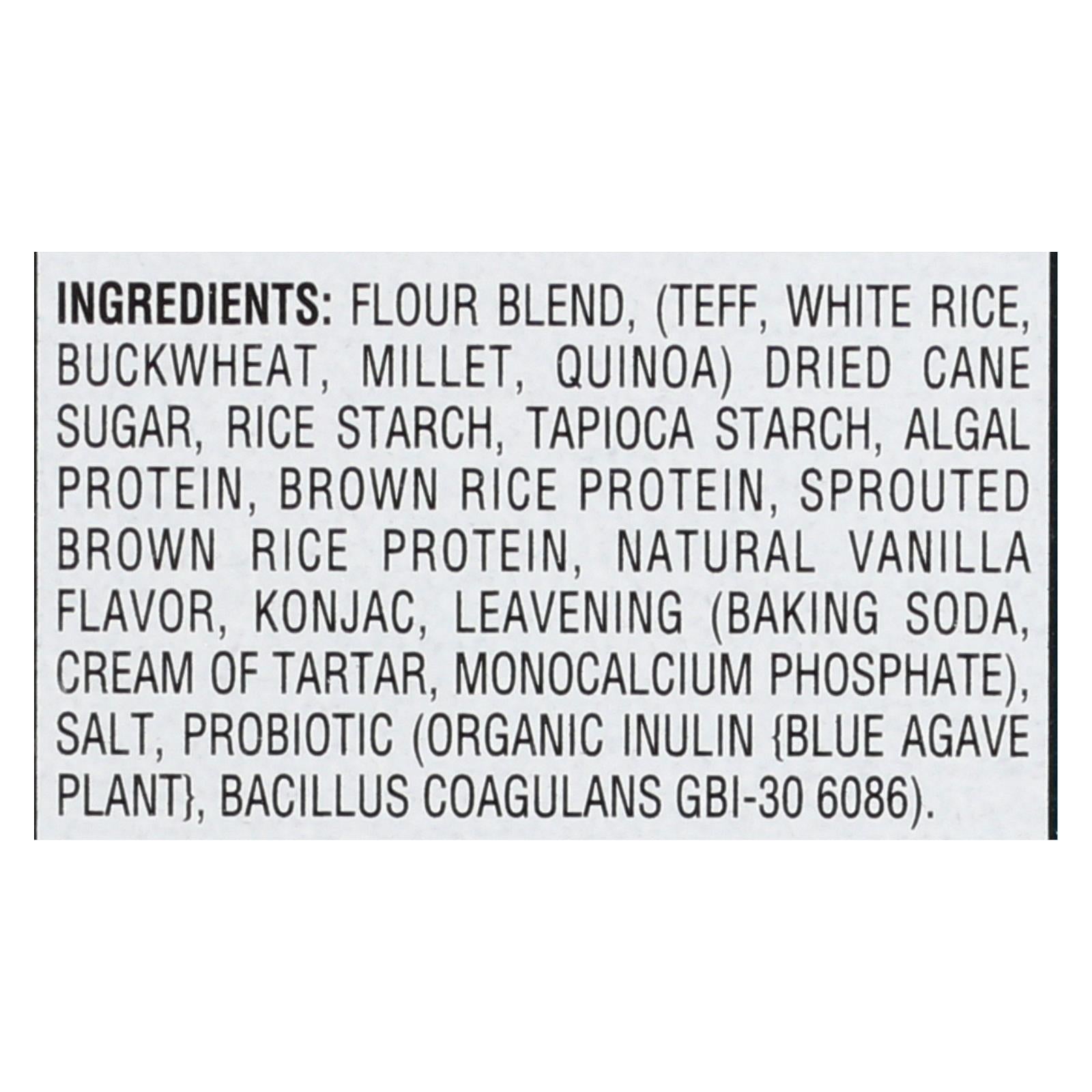 flour blend;teff;white rice;buckwheat;millet;quinoa;dried cane sugar;rice starch;tapioca starch;algal protein;brown rice protein;sprouted brown rice protein;natural vanilla flavor;konjac;leavening;baking soda;cream of tartar;monocalcium phosphate;salt;probiotic;organic inulin {blue agave plant};bacillus coagulans gbi-30 6086