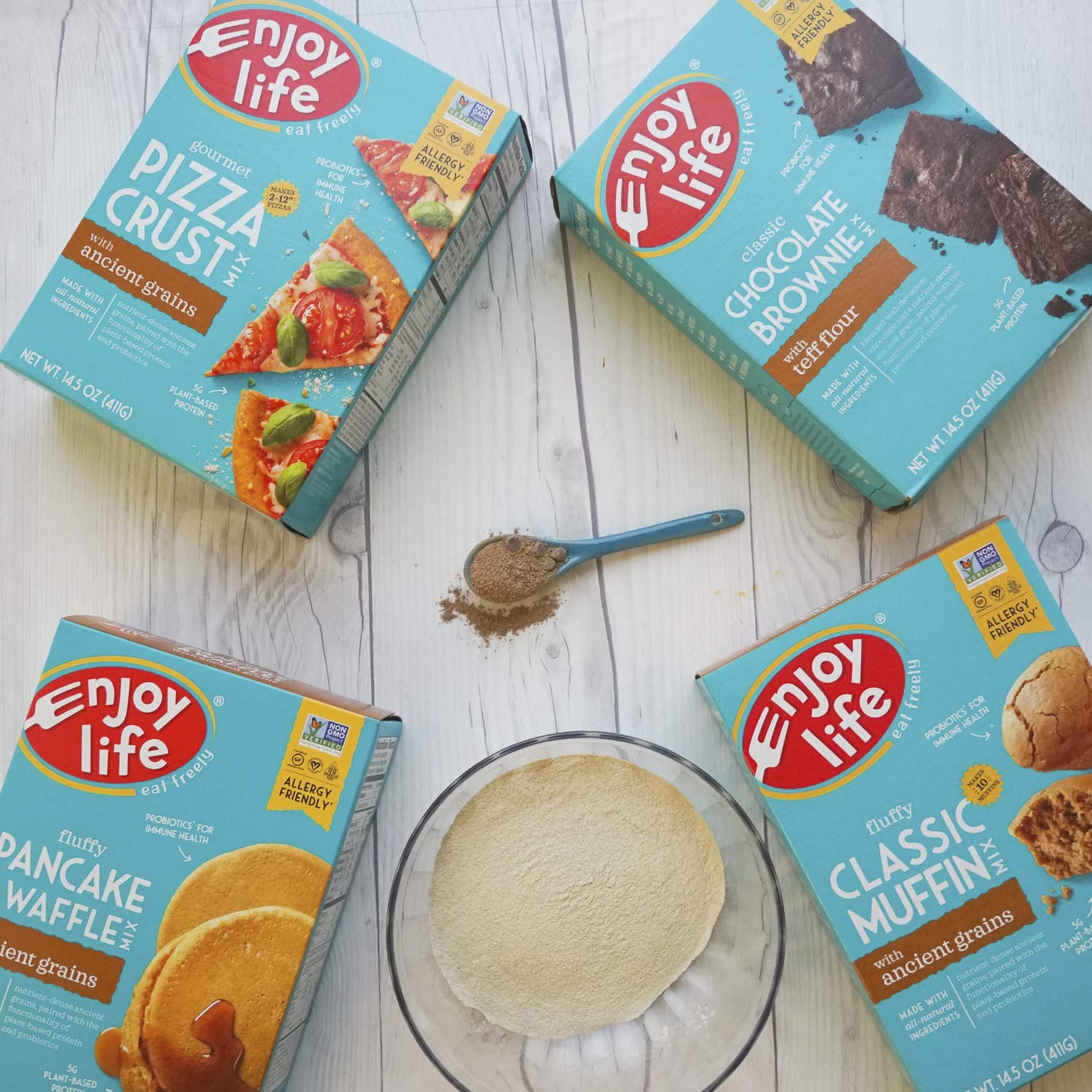 Enjoy life muffin mix with ancient grains is a healthy, delicious and convenient snack or meal option. made with naturally derived ingredients, this muffin mix is largely free of unnatural and unnecessary additives. this product is gluten-free, vegan friendly and kosher. each box of enjoy life muffin mix with ancient grains contains 14.5 oz. of muffin mix. see nutrition facts panel for allergens.