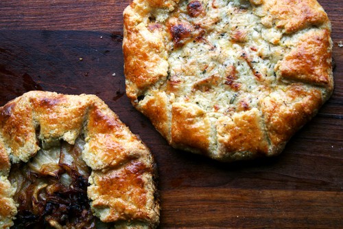 Unfold one galette round and top with layer of caramelized onions, leaving 2-inch border exposed. Cover onions with layer of pears. Top with layer of herb-Fontina mixture. Lift edges of dough and fold them inward, pleating as you go, to form folded-over border, pinching together any tears. Brush egg-yolk mixture over exposed crust. Repeat assembly with remaining galette. Chill assembled galettes 15 minutes.