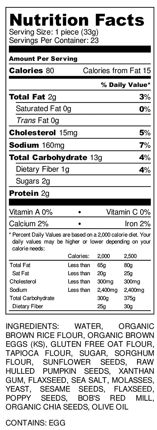 Water, Organic Brown Rice Flour, Organic Brown Eggs (KS), Gluten Free Oat Flour, Tapioca Flour, Sugar, Sorghum Flour, Sunflower Seeds, Raw Hulled Pumpkin Seeds, Xanthan Gum, Flaxseed, Sea Salt, Molasses, Yeast, Sesame Seeds, Flaxseed, Poppy Seeds, Bob's Red mill, Organic Chia Seeds, Olive Oil, CONTAINS: Egg