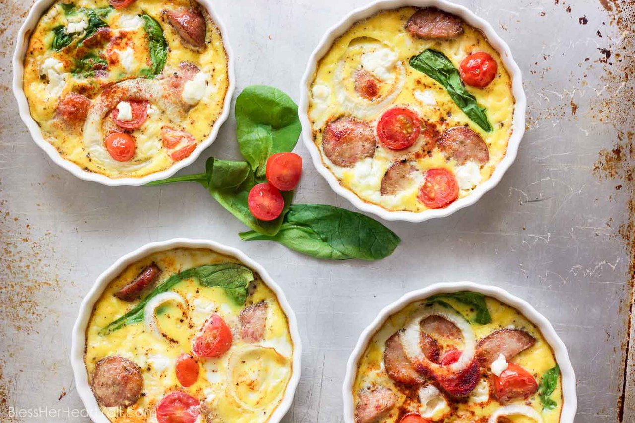 - Inside each of the 4 ramekins, toss in equal parts of the goat cheese, spinach, tomatoes, onion, and sausage.