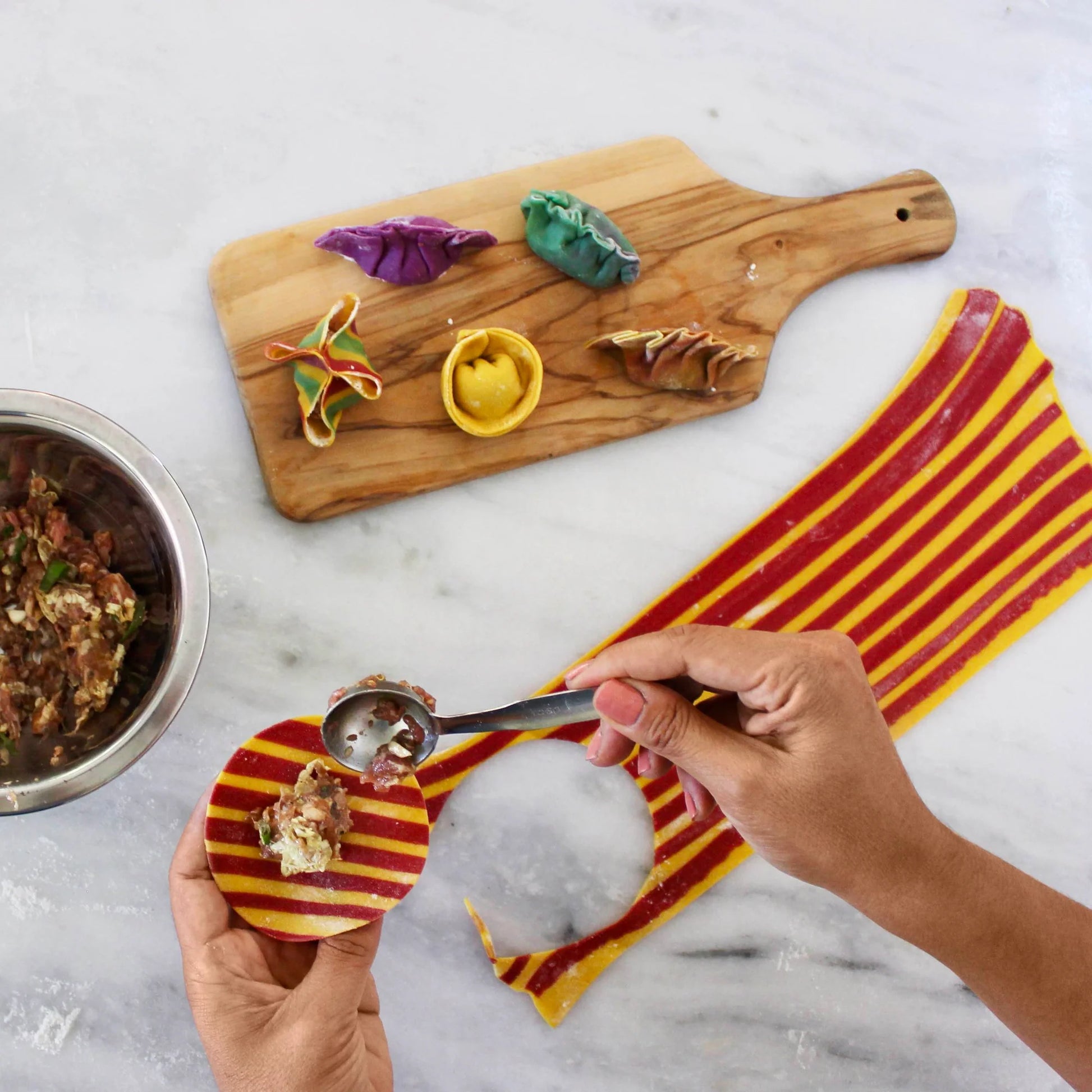 - DUMPLING KIT WITH INGREDIENTS: This DIY food kit comes with unique shelf stable ingredients such as bread flour to make the perfect dumpling wrappers, and four plant-based natural dyes (red, yellow, purple, and green). Add your favorite fresh fillings, such as the included recipe for pork or chicken dumplings. Plus, this dumpling kit even includes a dumpling rolling pin and dumpling cutter!