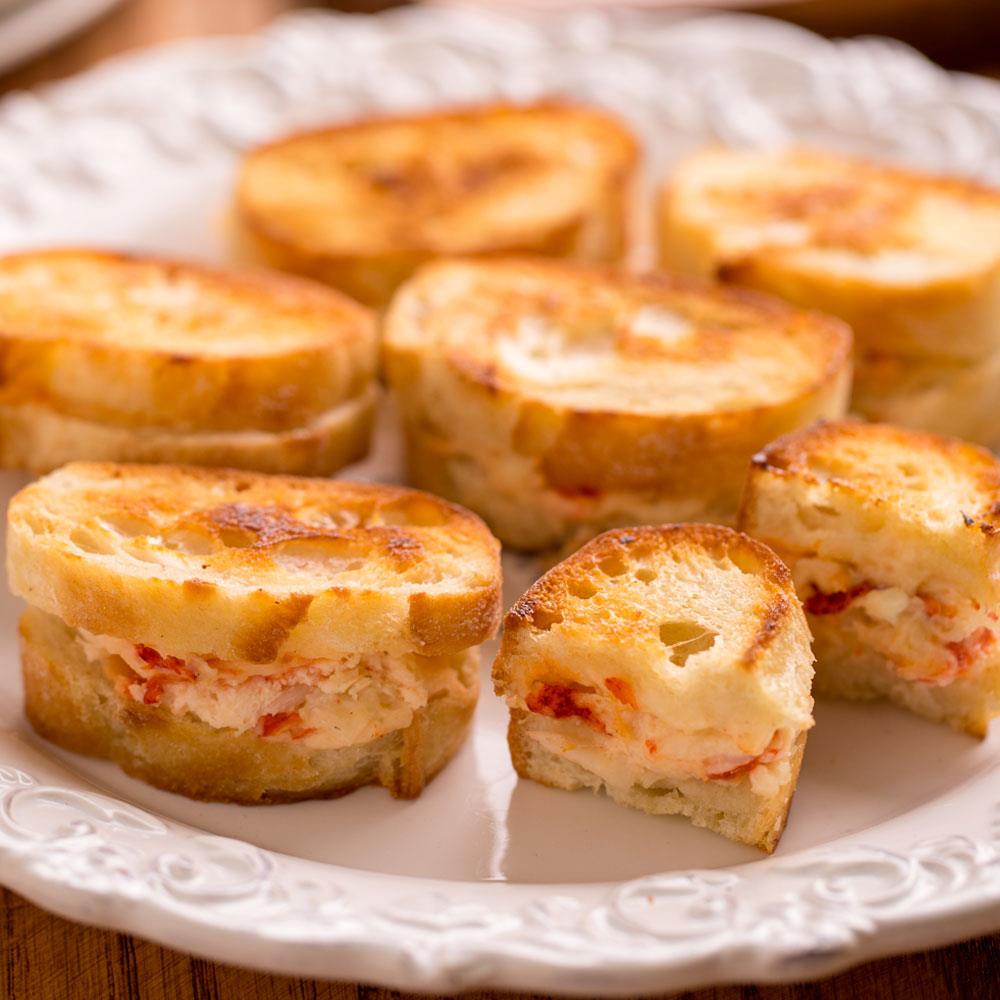 This is the Gourmet favorite go to appetizer that combines four types of cheeses, fresh Maine lobster, and a crispy sourdough baguette. The mini grilled cheese sandwiches are made with a unique family recipe by an award-winning lobster company based in Maine. Using a blend of Swiss, Romano, Parmesan, and cream cheese, the petite two-bite hors d’oeuvres bring a gourmet twist to a classic comfort food. Includes 18 sandwiches ready to heat and serve.