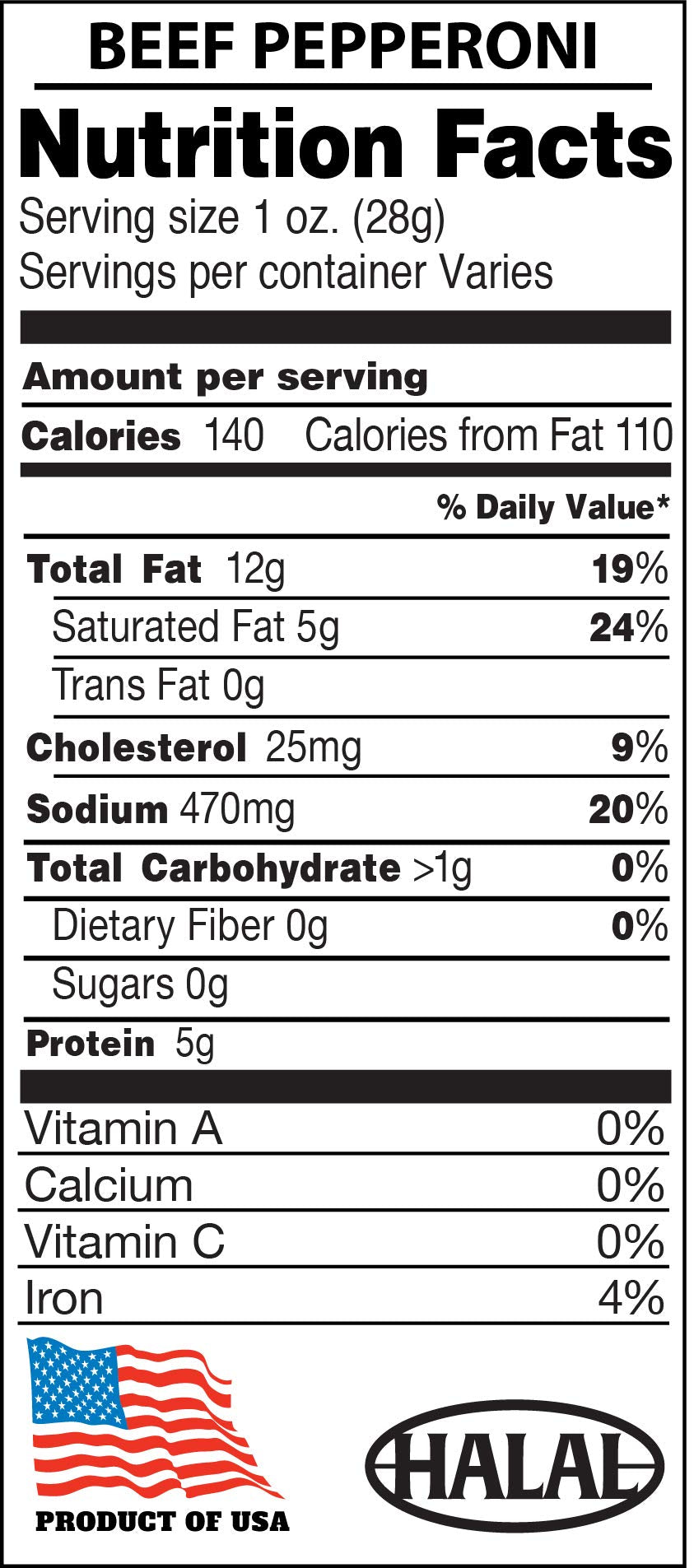Halal Beef, Salt, Sugar, Water, Oleoresin of Paprika, Natural Smoke Flavoring, Lactic Acid Starter Culture, Garlic Powder, Flavoring, Sodium Nitrite, Ascorbic Acid, BHA, BHT, Citric Acid.