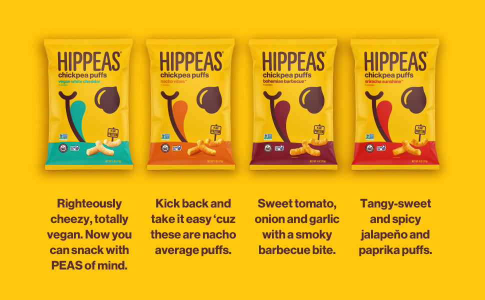 Hippeas Chickpea Puffs, Variety Pack - Vegan White Cheddar, Nacho Vibes, Barbecue, Sriracha - Pack of 18