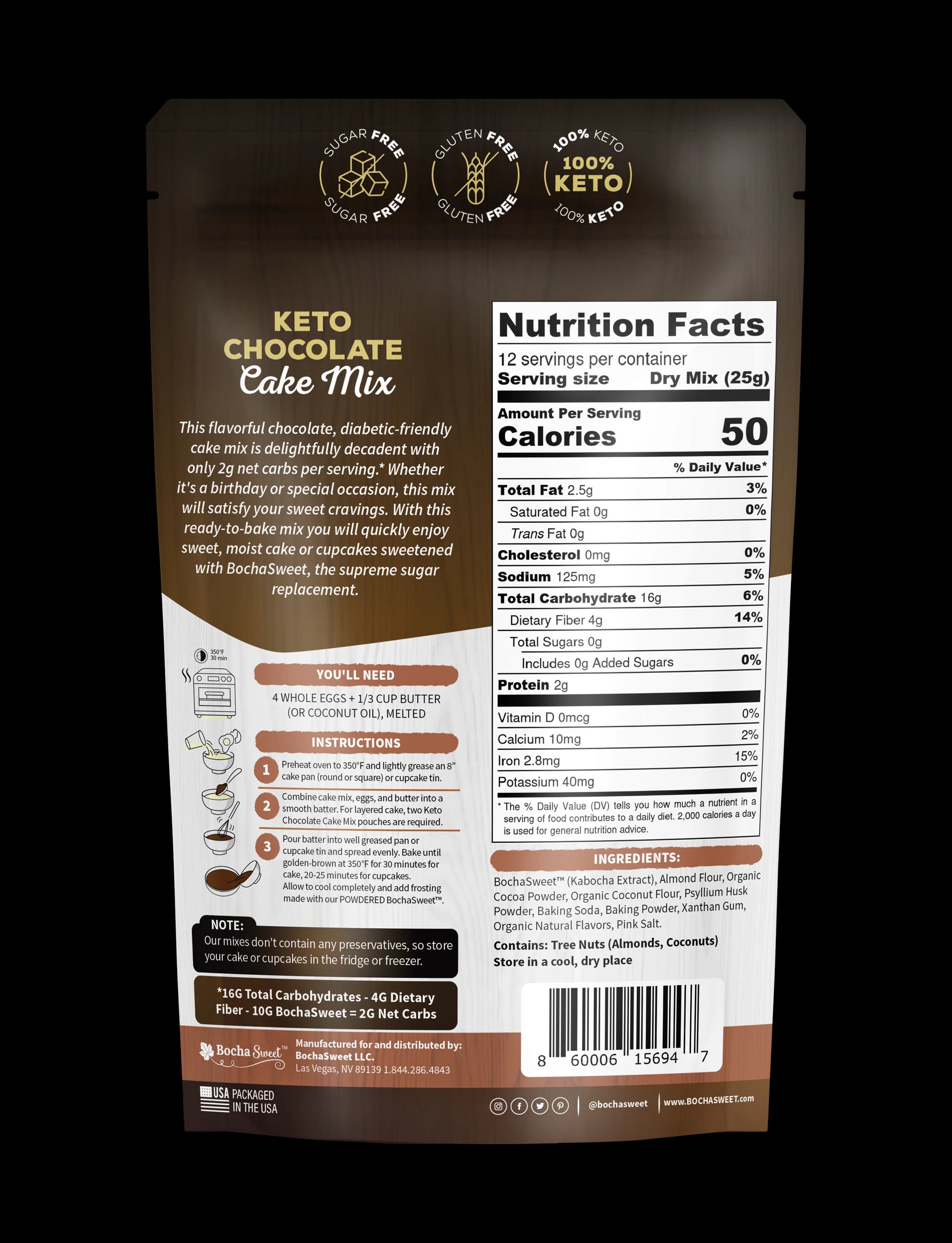 Keto Chocolate Cake Mix makes delicious, diabetic-friendly cakes and cupcakes. Sweetened with BochaSweet, it's sugar-free, gluten-free and just 2g net carbs/serving.