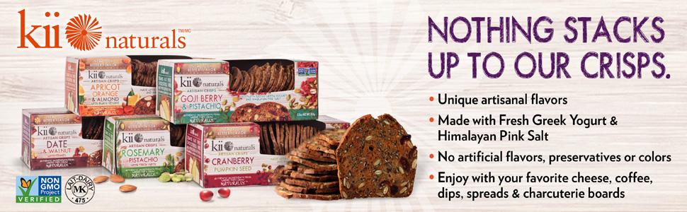 Kii Naturals goji berry & pistachio artisan crisps have a distinct savory and sweet flavor that pairs very well a dry white wine, some soft-cheese or creamy dips.