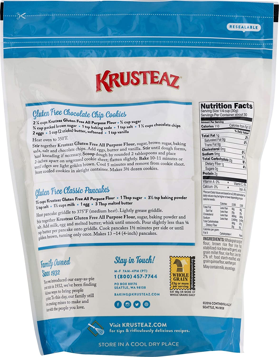 Krusteaz Gluten Free All Purpose flour mix replaces all-purpose wheat flour on a cup-for-cup basis. This unique, premium flour blend provides a simple solution to make delicious Gluten Free baked goods that the whole family will enjoy. Family owned since 1932, our story started in Seattle with an easy-to-prepare pie crust mix named "Krusteaz" (Crust + ease). Our innovative spirit helped us grow from a Northwest tradition to a national favorite bringing families together through great tasting food. Today our product line includes pancakes, waffles, muffins, breads, cookies, dessert bars, cornbread, crumb cakes and more. One bite and you'll know why Krusteaz is a such a cherished tradition.