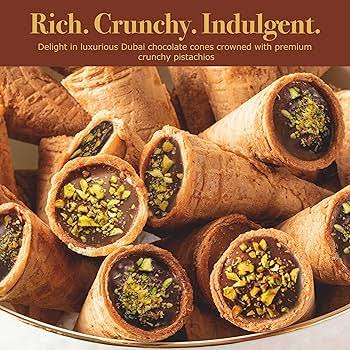 - Authentic Belgian Chocolate: Crafted with rich, smooth Belgian chocolate for a decadent treat. These Dubai chocolate cones are perfect for gifting or indulging in yourself—experience the taste of luxury with every bite.