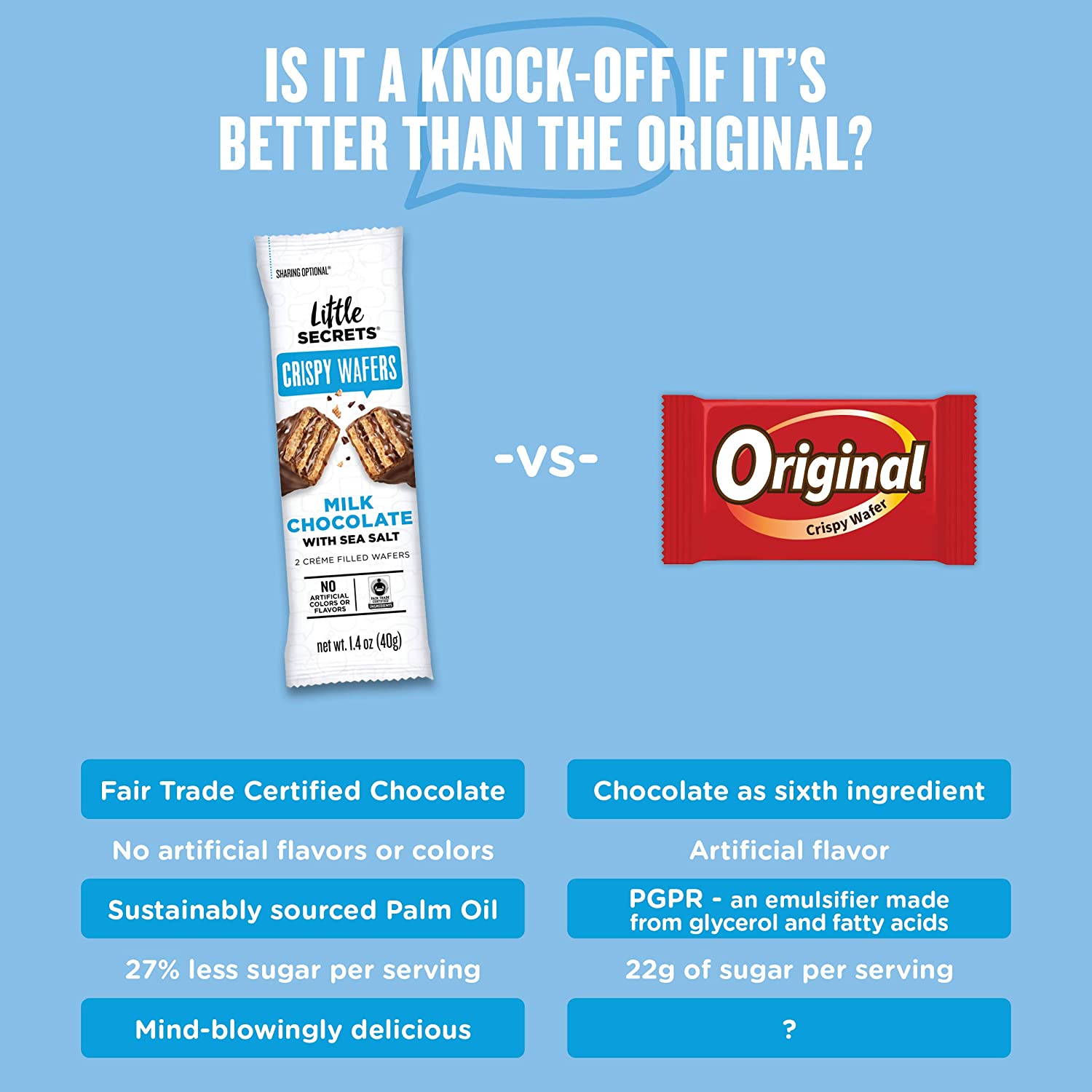 - IT’S OUR LITTLE SECRET: Three crispy wafers layered between airy, Fair Trade Certified dark chocolate crème, drenched in premium dark chocolate and topped with sea salt come together for an unreal chocolate combination of textures and tastes that are guaranteed to delight. It’s a drool-worthy and sophisticated chocolate classic but without the cringe-worthy ingredients.