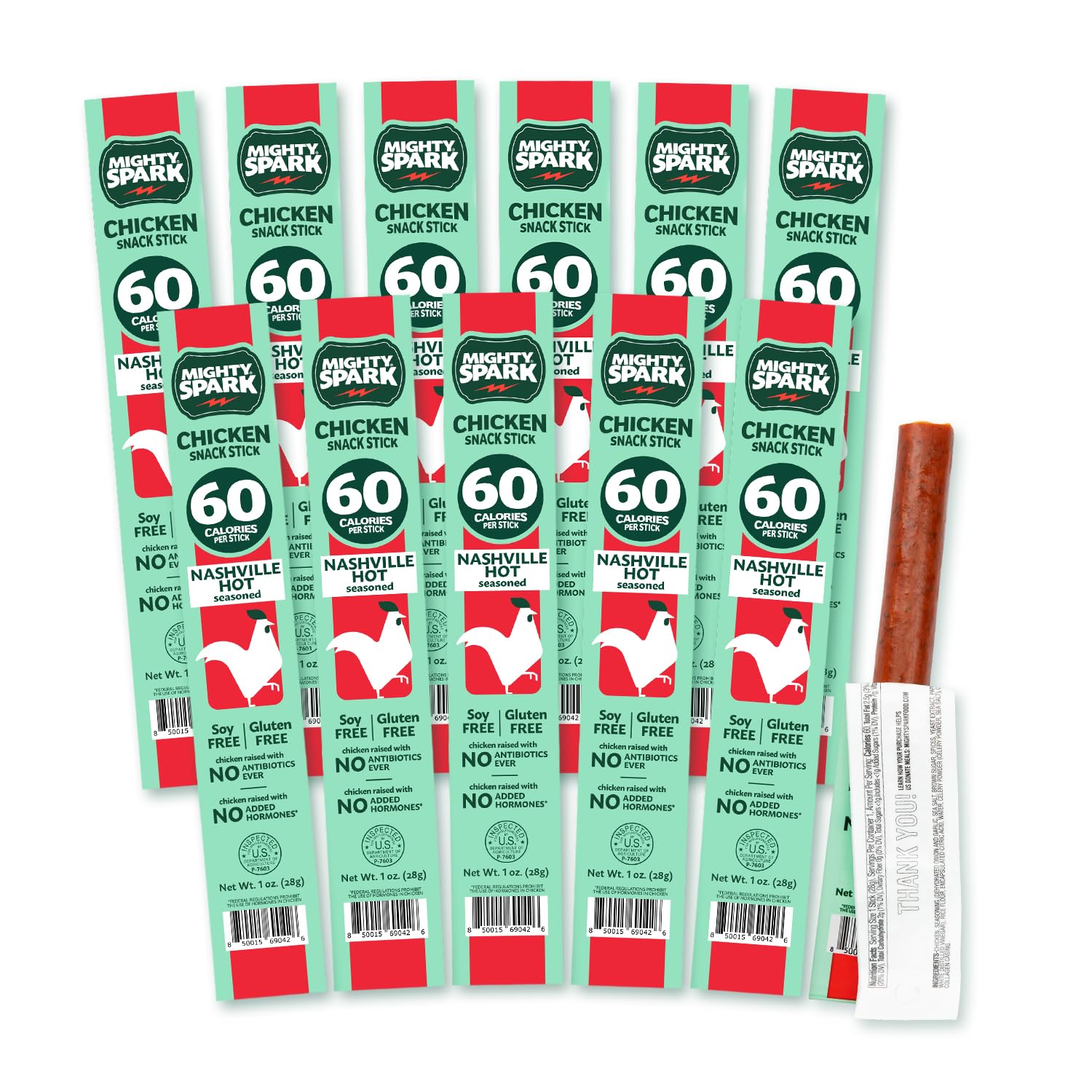- PORTABLE PROTEIN SNACK: Mighty Spark's protein chicken snack sticks are the perfect pairing for your gym bag, desk drawer, or as road trip snacks. These chicken snack sticks are soy free, gluten free, only 60 calories and packed with 7 grams of all-natural protein. Available in 4 flavors.