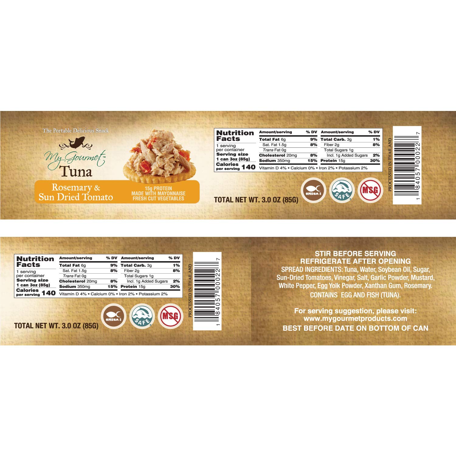 - FRESH-CUT VEGGIES & REAL MAYO: My Gourmet Products brings you premium tuna salads made with flaked light tuna, fresh-cut vegetables, and mayonnaise. No preservatives, no colors, no MSG.