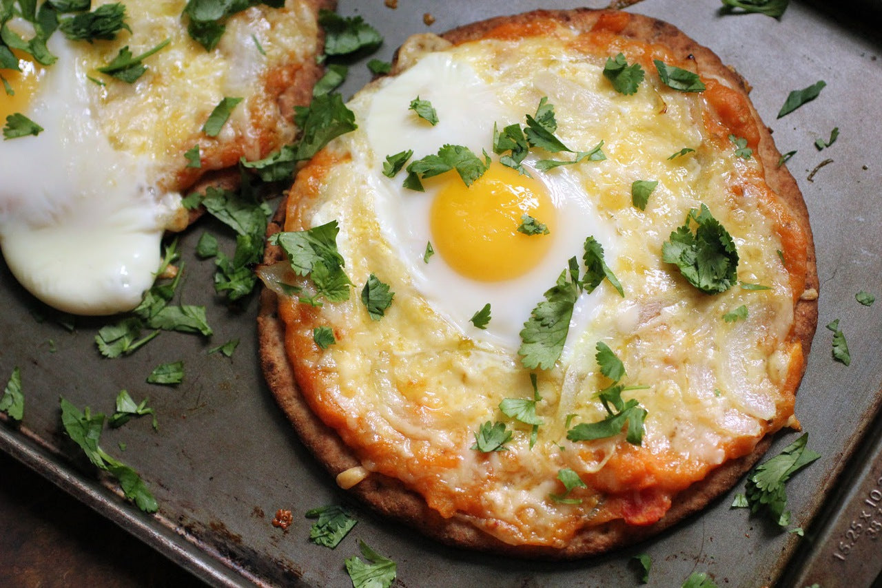 Bake the pizza for about 8-10 minutes total and rotate 180 degrees halfway through. Take it out when the cheese is melted and the egg is cooked to your liking. Garnish with cilantro or herbs and let the pizza cool but not so much that it’s not gooey anymore:) Add salt & pepper to your taste.