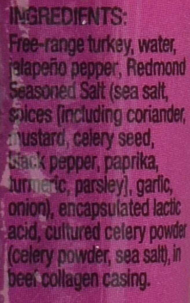 Ingredients: Free-range turkey, water, jalapeno pepper, Redmond Seasoned Salt (sea salt, spices [including coriander, black pepper, celery, mustard, parsley, paprika, turmeric], garlic, onion), encapsulated lactic acid, cultured celery powder (celery powder, sea salt), in beef collagen casing.