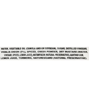 Water, Vegetable Oil (Canola and/or Soybean), Sugar, Distilled Viniegar, Vidalia(r) Onions(5%), Mustard(vinegar, Water, Mustard Seed, Salt, Turmeric, Paprika, Spices, Garlic Powder), Onion Powder, Salt, Natural Spices, Xanthan Gum, Potassium Sorbate, Sodium Benzoate and Calcium Disodium Edta(preservatives), Yellow 5(Color).
