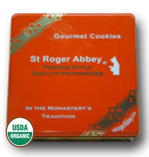 Assortment of lemon cookies presented in a metal box decorated with paintings from St Roger Abbey Store.