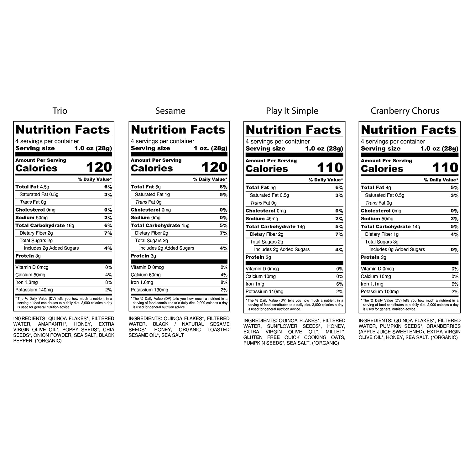 Snappy contrast of tangy sweetness and toasty crunch. Made with whole grain quinoa, healthy pumpkin seeds & apple sweetened cranberries.