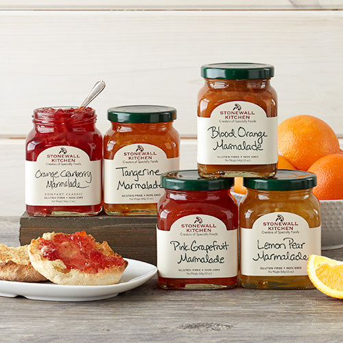 Marmalades are fruit preserves made from the juice and peel of citrus fruits boiled with sugar and water. This collection has some of our favorites. Each one is authentic and has a bright, citrusy taste that goes so well on toast, muffins or in desserts.