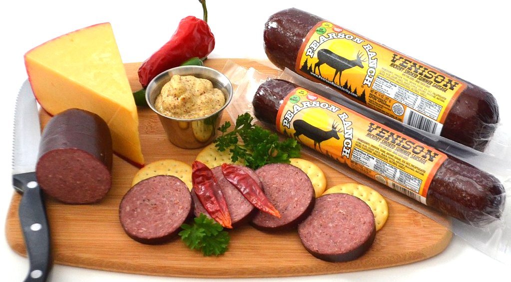 - EXOTIC GAME MEAT HICKORY SMOKED SUMMER SAUSAGE VARIETY PACK - Pearson Ranch Game Meat Hickory Smoked Summer Sausage Pack Features Elk (Made with added Pork) 7oz, Buffalo (Made with added Pork) 6oz, Venison (Made with added Pork) 7oz.
