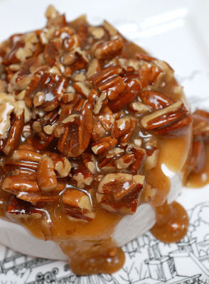 Working quickly, mound warm nut mixture on top of Brie and let caramel cascade down sides of cheese.