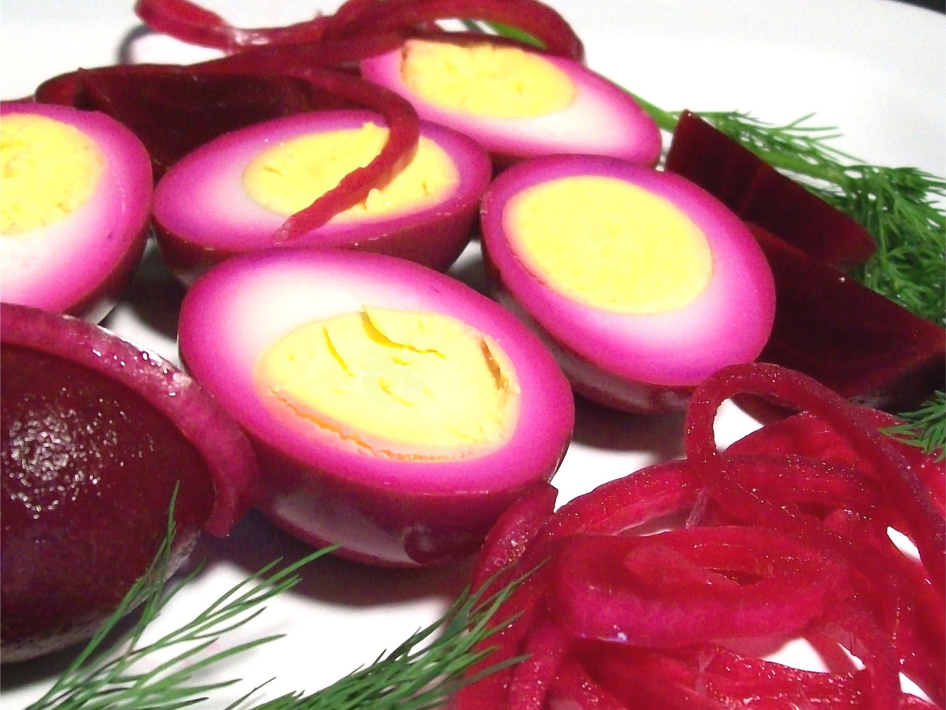 - Hard boiled chicken eggs pickled in an all-natural, beet and vinegar brine