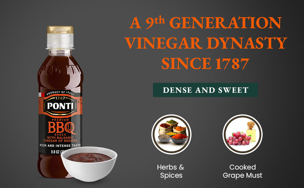 - GOURMET CRAFTED GLAZE. Ponti’s multi-dimensional Premium BBQ Glaze Balsamic Vinegar of Modena is custom-made for deep and rich lingering taste. Brings out bold and smoky flavors in marinades for grilled and roasted dishes. Excellent for wine pairing earthy reds with dark meats and semi-sweet whites with poultry.