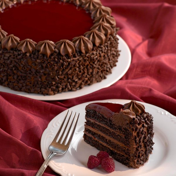 Serve up a decadently sweet dessert that guests won't soon forget with this Pellman raspberry chocolate cake. This cake features four layers of moist chocolate cake with chocolate mouse and real raspberry puree between each layer. The cake is smothered with a creamy, mouthwatering chocolate frosting, while the sides are adorned by mini-gourmet chocolate curls that provide a richer taste and a greater aesthetic. A thin layer of red raspberry puree and a decorative chocolate border on top not only help draw customers' eyes to this delicious dessert, but also make it perfect for any patron looking to satisfy their sweet tooth.