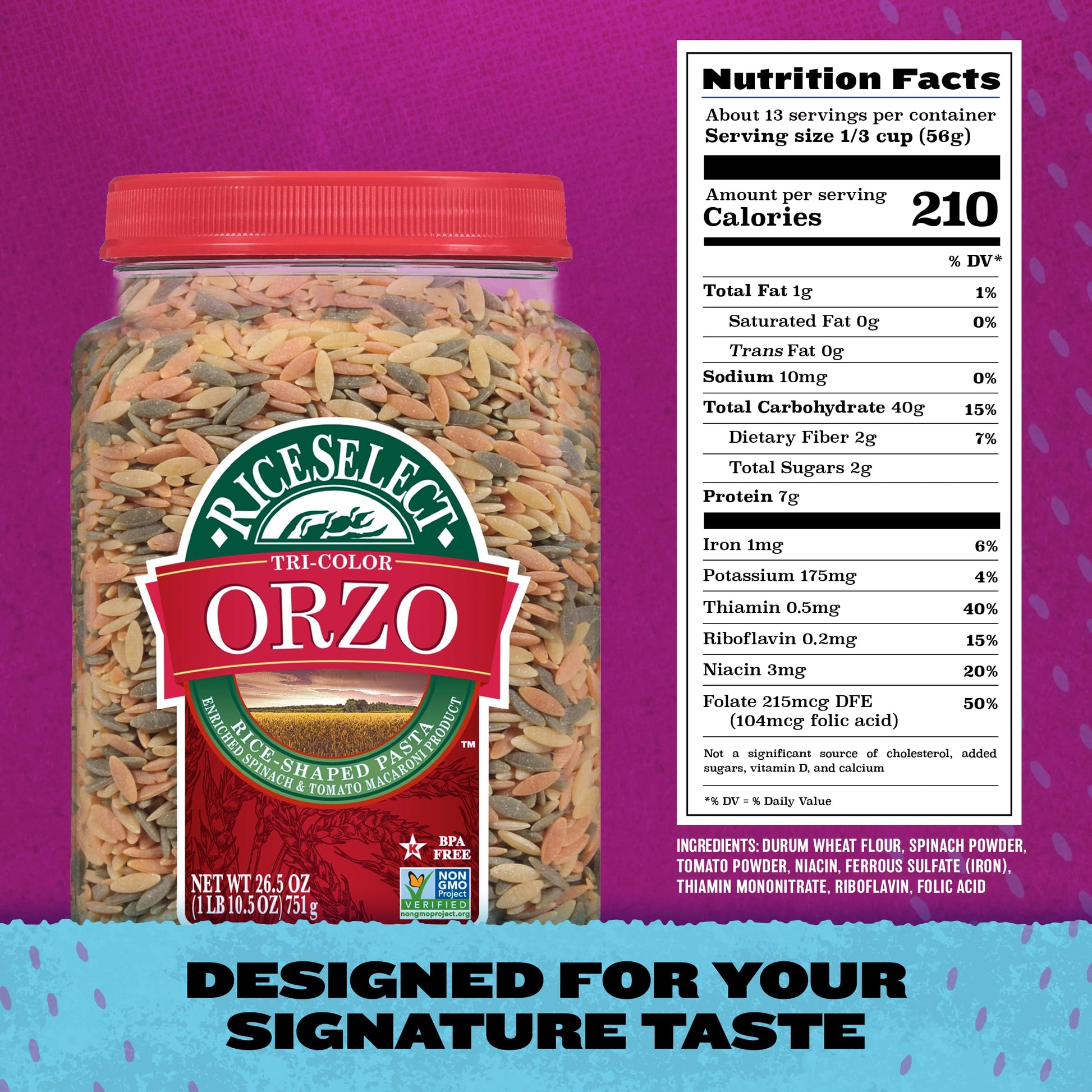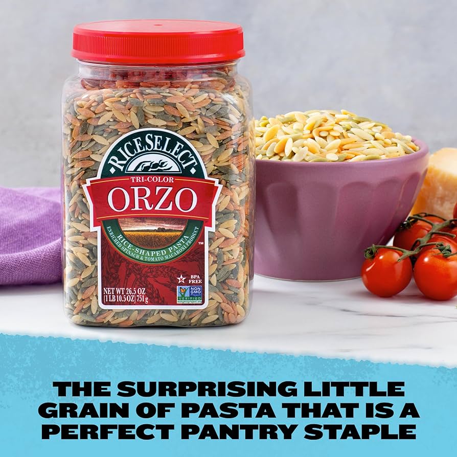 RiceSelect Tri-Color Orzo Rice Shaped Pasta, Premium Spinach and Tomato - Non-GMO Orzo Pasta - 32 oz Jar