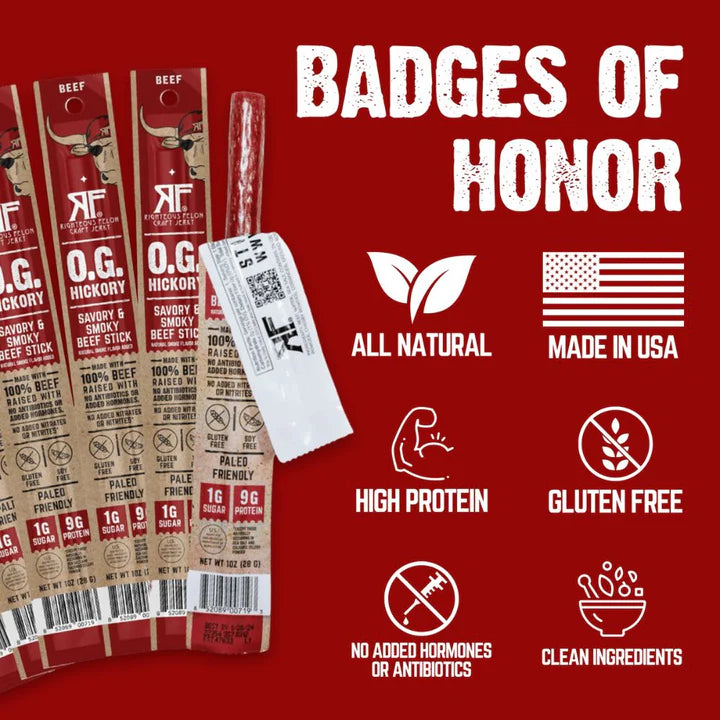 - O.G. Hickory Beef Sticks: Experience the bold, smoky flavor of Righteous Felon beef meat sticks with our O.G. Hickory recipe. Crafted from premium American beef, these beef sticks individually wrapped have a rich, hickory taste that's been perfected since '96. Ideal for anyone who appreciates authentic, robust flavors.