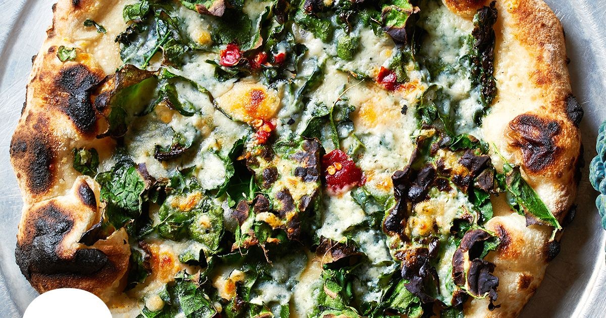Traditional Italian Lacinato (or Tuscan) kale, aged cheddar and Calabrian chilies top this mouth-watering Wood Fired Baby Sinclair pie from Roberta's of Brooklyn.