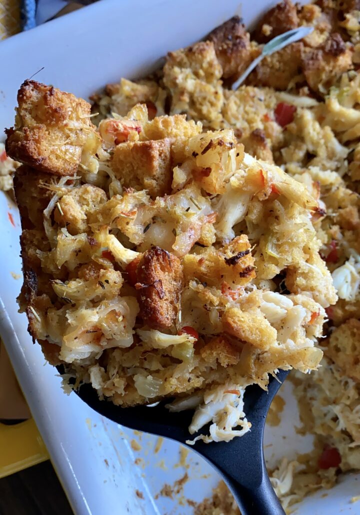 This Seafood Stuffing is the perfect pairing for any meal–especially during the holidays. Seafood Stuffing is packed with crab meant, scallops & shrimp with Old Bay Seasoning