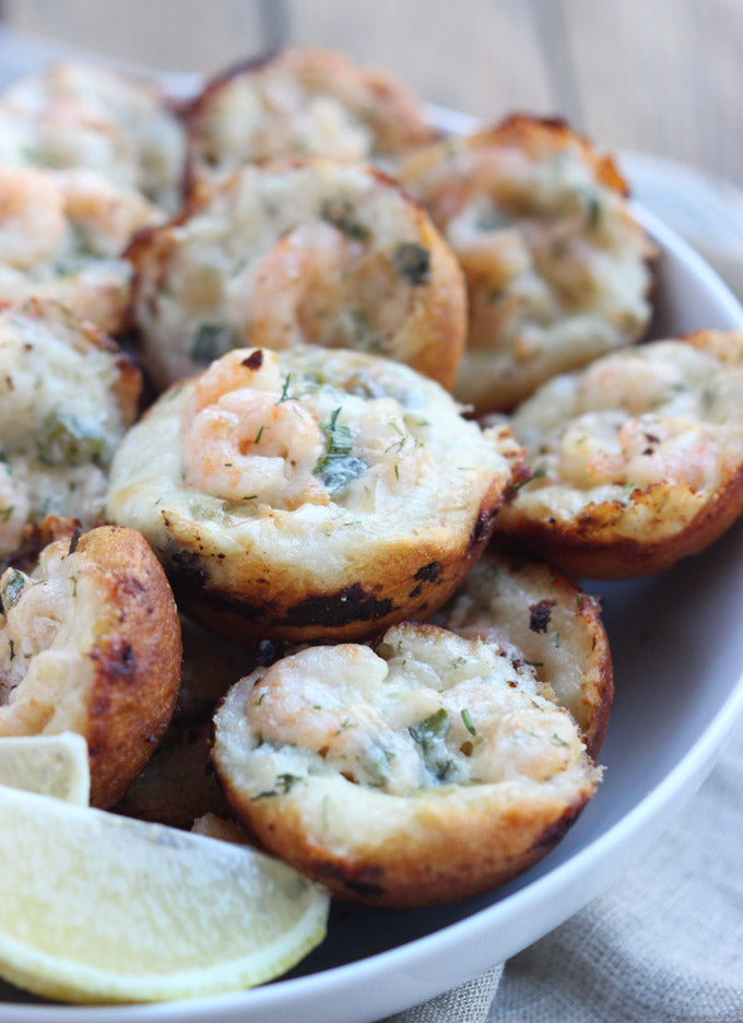 - Spoon 1 tablespoon of the shrimp mixture on top of each biscuit. Bake for 20-25 minutes, or until the poppers are golden and bubbly.