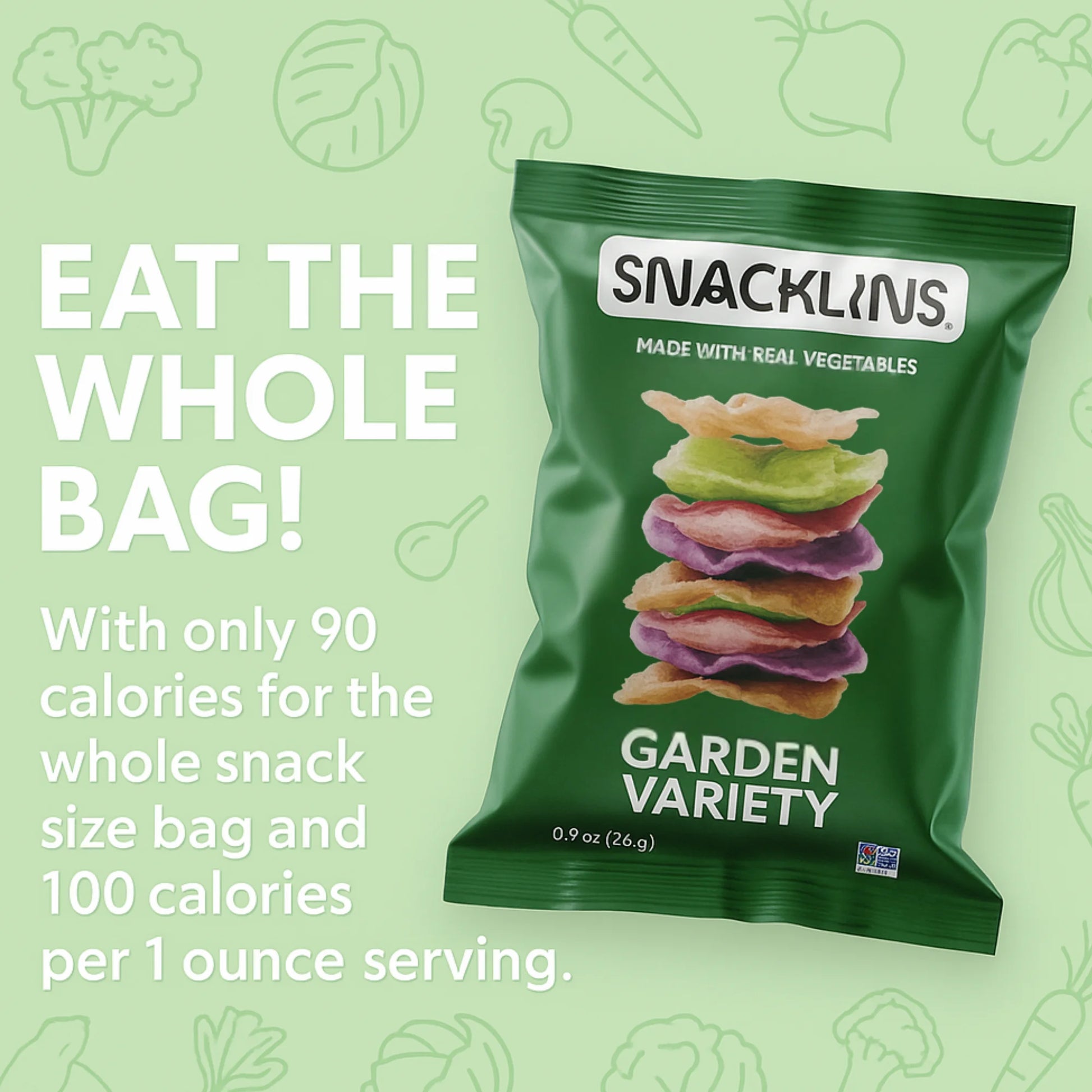 - Eat the whole Bag—with just 90 calories for the entire snack size bag and 100 calories per 1-ounce serving, enjoy these delicious snacks guilt-free! Snacklins Garden Variety is made with simple, wholesome ingredients and is free from artificial additives, preservatives, and gluten. Indulge without compromise and feel good about what you’re eating!