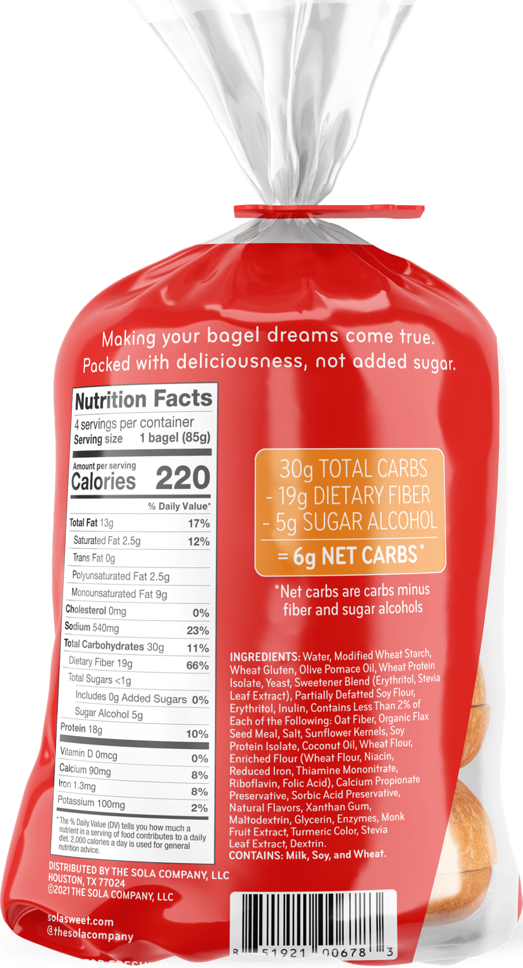 You asked, we listened. SOLA bagels have a new look, with the same great taste. SOLA Everything and Sesame bagels, 4 CT. now have toppings incorporated into the bagels for less mess. SOLA has crafted a keto-friendly, low-carb bagel which keeps the fluffy, and chewy texture you love with none of the aftertaste. Helping your mornings become a little brighter with a low-carb bagel and your favorite topping.