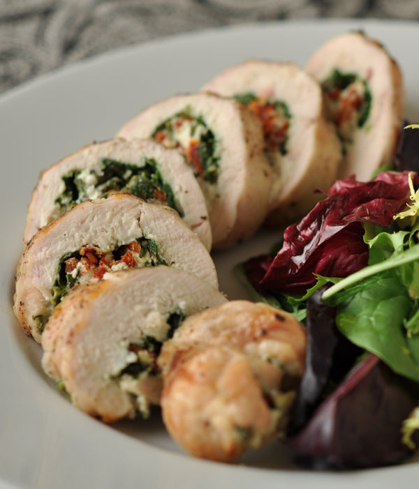 Marinated breast roll filled with flavorful spinach, sundried tomatoes, pimentos, pine nuts, feta and fontina cheeses Gluten free