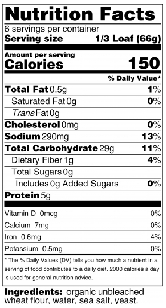 Organic Unbleached Wheat Flour, Water, Sea Salt, Organic Barley Malt.